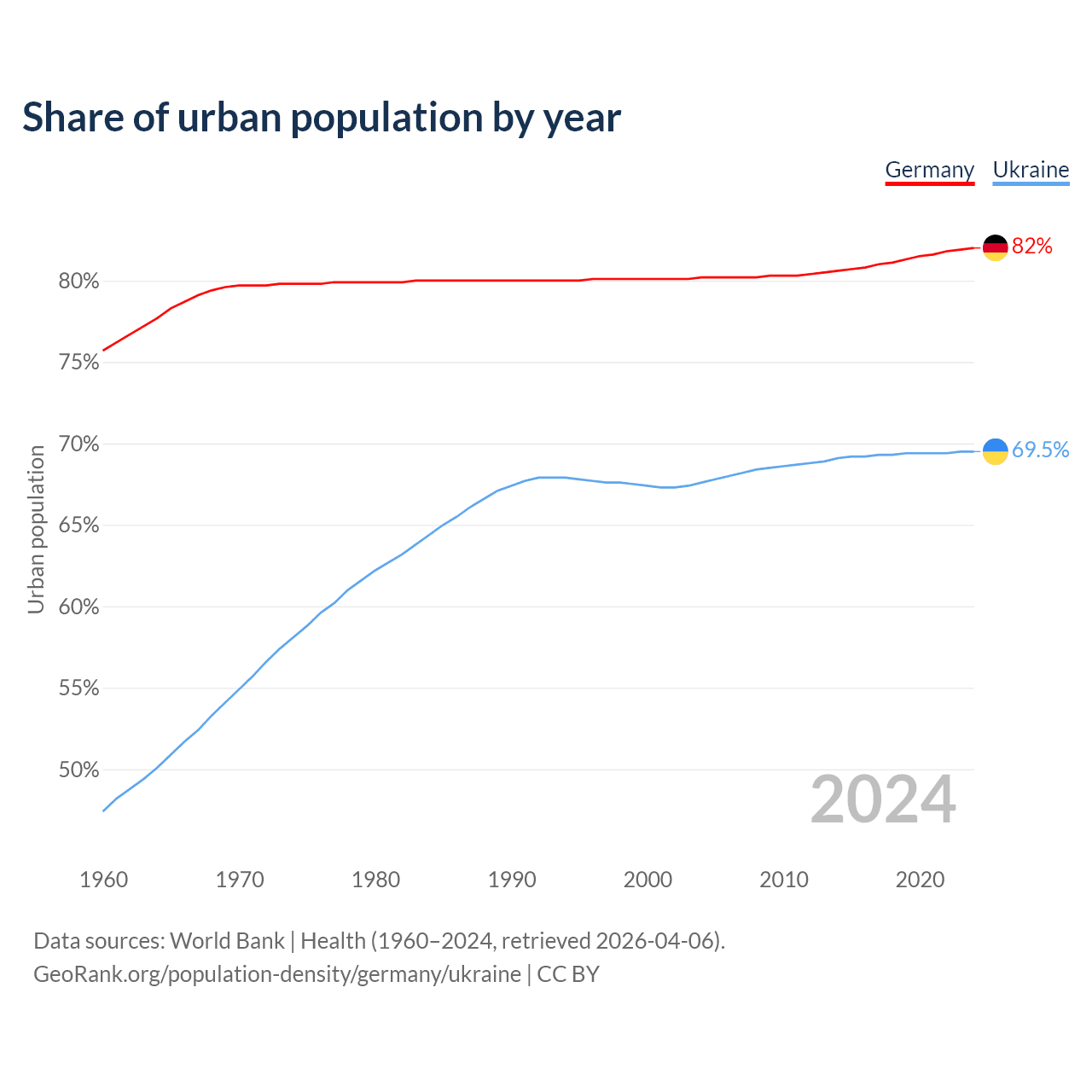 From 2004 to 2024, the share of urban population changed from 80.2% to 82% in Germany and from 67.6% to 69.5% in Ukraine.