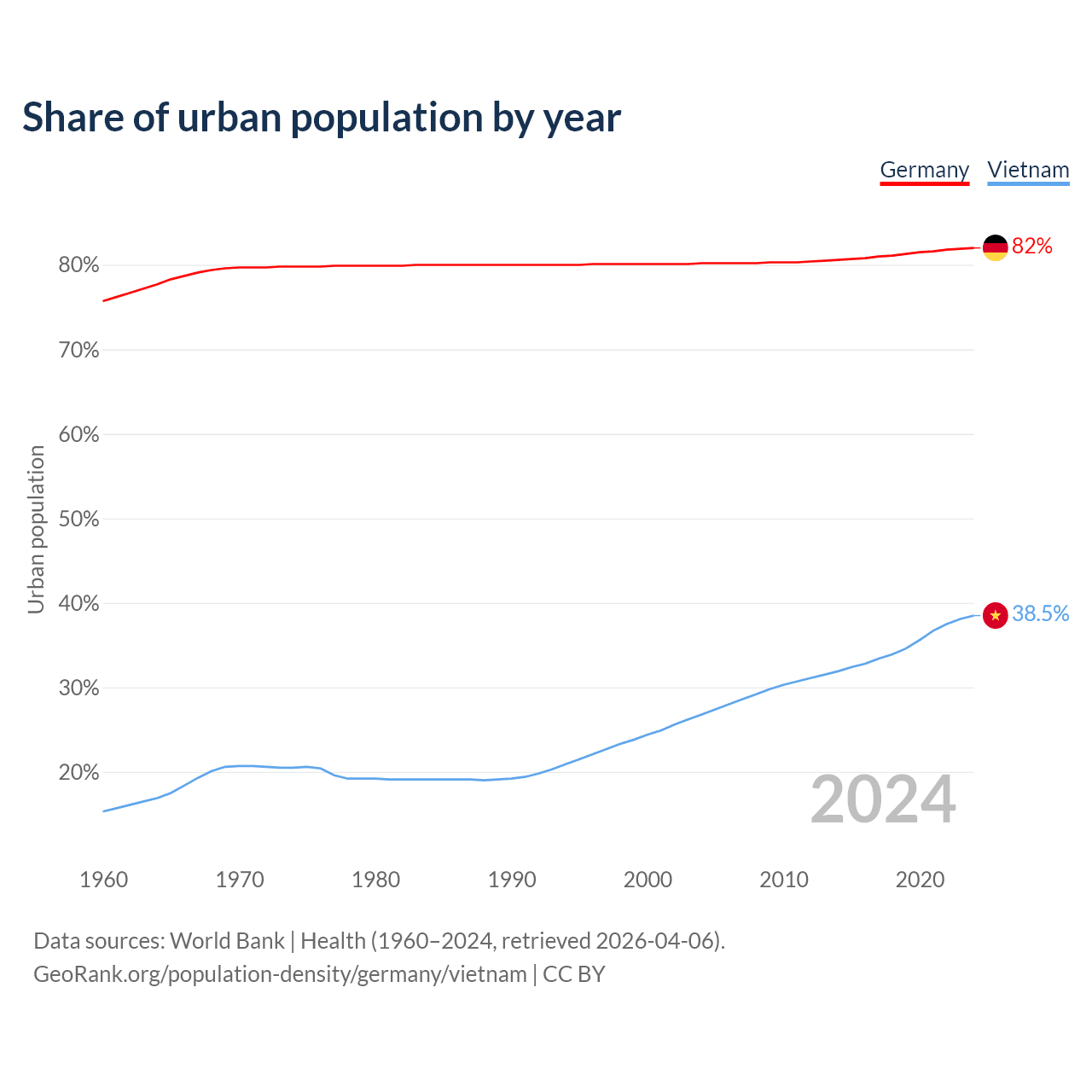 From 2004 to 2024, the share of urban population changed from 80.2% to 82% in Germany and from 26.8% to 38.5% in Vietnam.