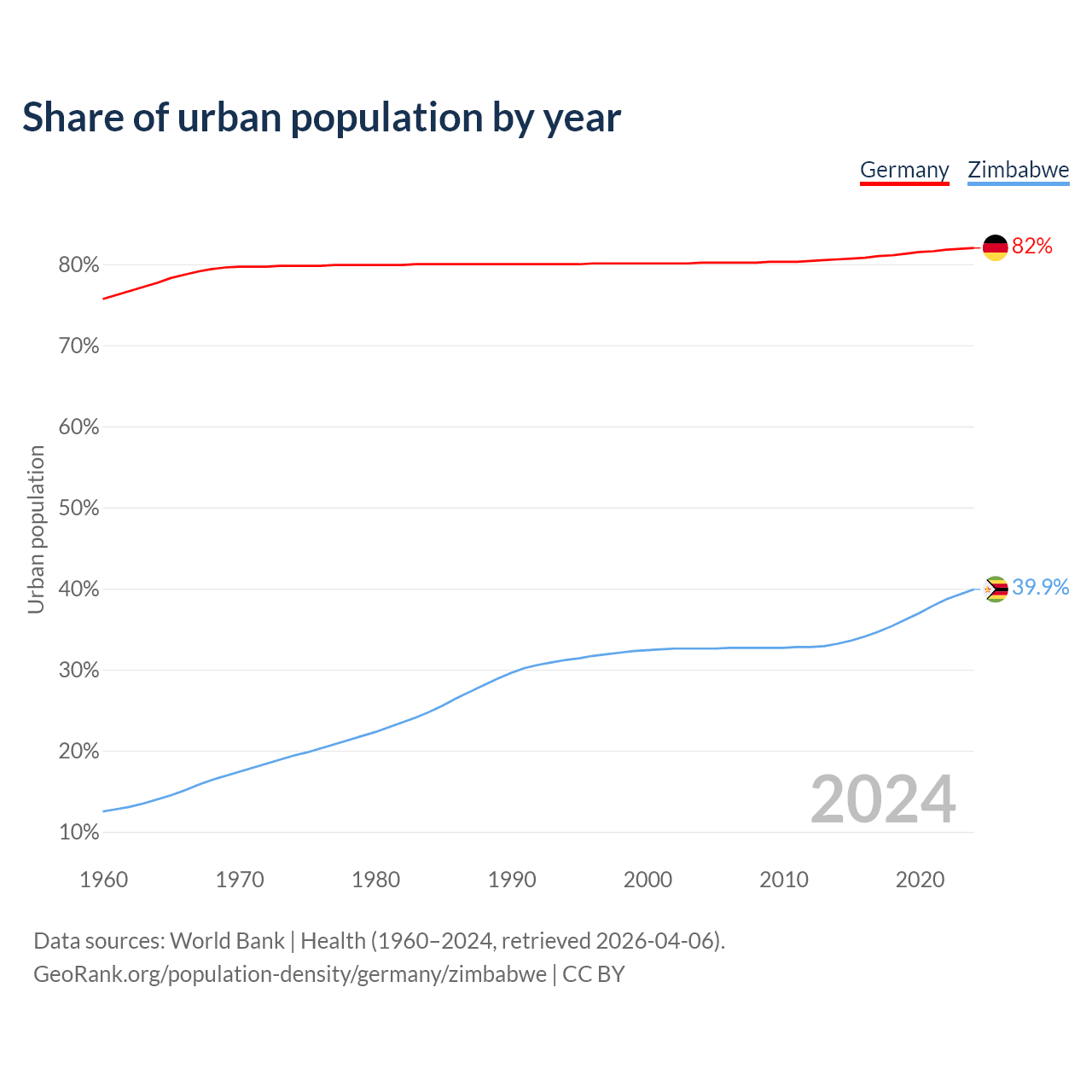 From 2004 to 2024, the share of urban population changed from 80.2% to 82% in Germany and from 32.6% to 39.9% in Zimbabwe.
