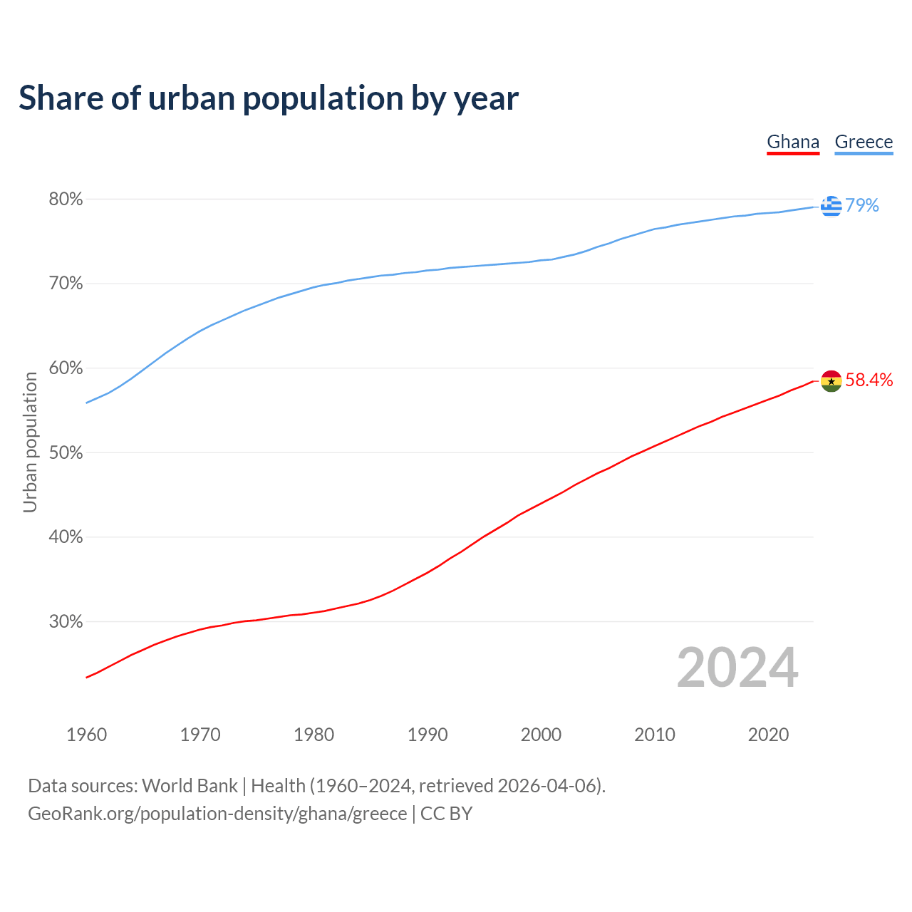 From 2004 to 2024, the share of urban population changed from 46.8% to 58.4% in Ghana and from 73.8% to 79% in Greece.