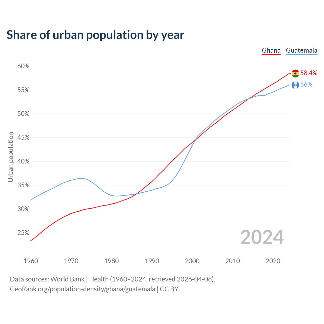 From 2004 to 2024, the share of urban population changed from 46.8% to 58.4% in Ghana and from 47.3% to 56% in Guatemala.