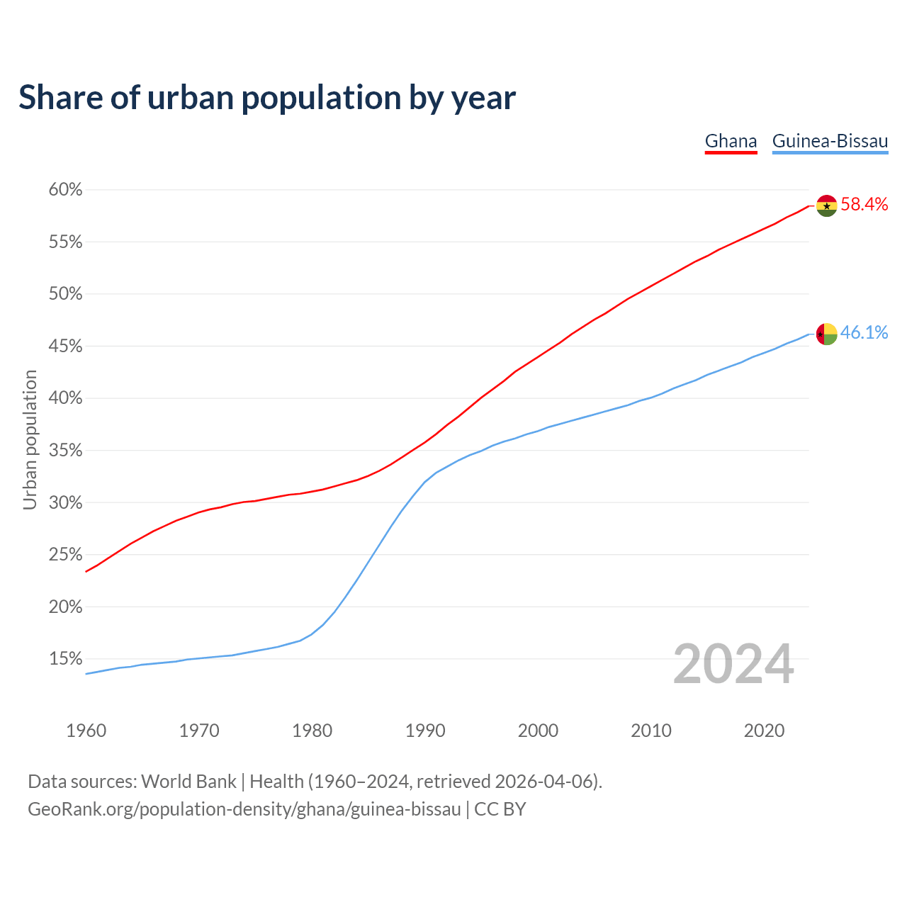 From 2004 to 2024, the share of urban population changed from 46.8% to 58.4% in Ghana and from 38.1% to 46.1% in Guinea-Bissau.