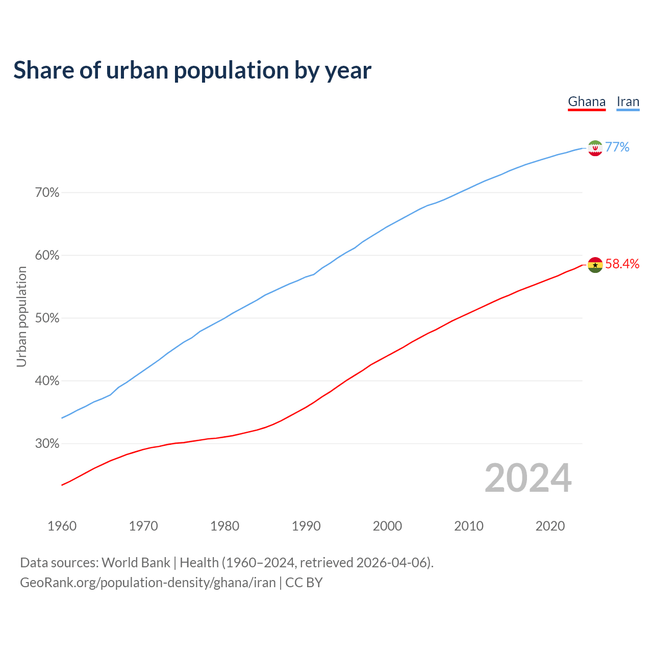 From 2004 to 2024, the share of urban population changed from 46.8% to 58.4% in Ghana and from 67.3% to 77% in Iran.