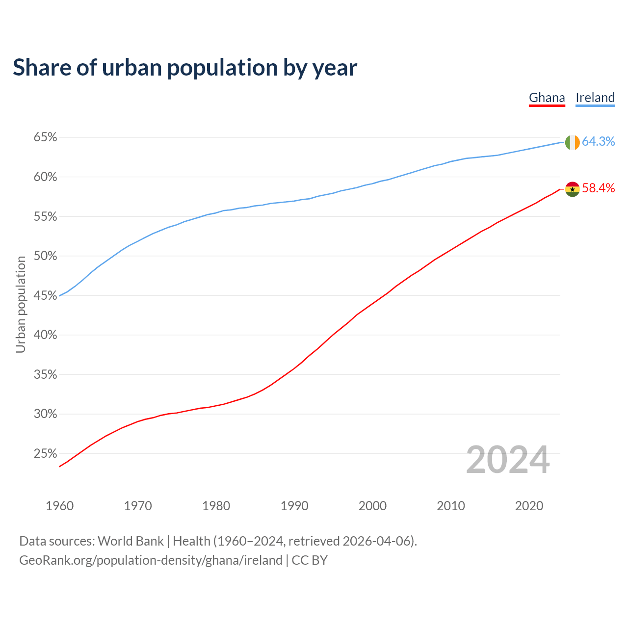 From 2004 to 2024, the share of urban population changed from 46.8% to 58.4% in Ghana and from 60.2% to 64.3% in Ireland.