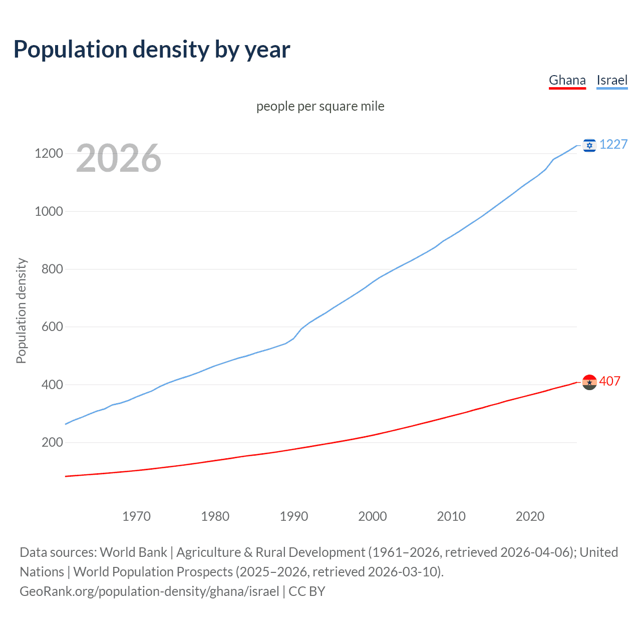 From 2006 to 2026, population density in Ghana increased by 55%, compared to a 45.4% growth in Israel.