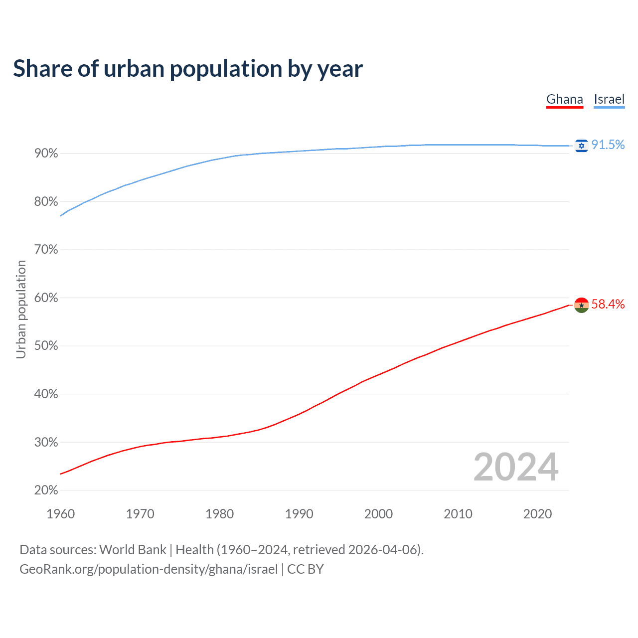 From 2004 to 2024, the share of urban population changed from 46.8% to 58.4% in Ghana and from 91.6% to 91.5% in Israel.