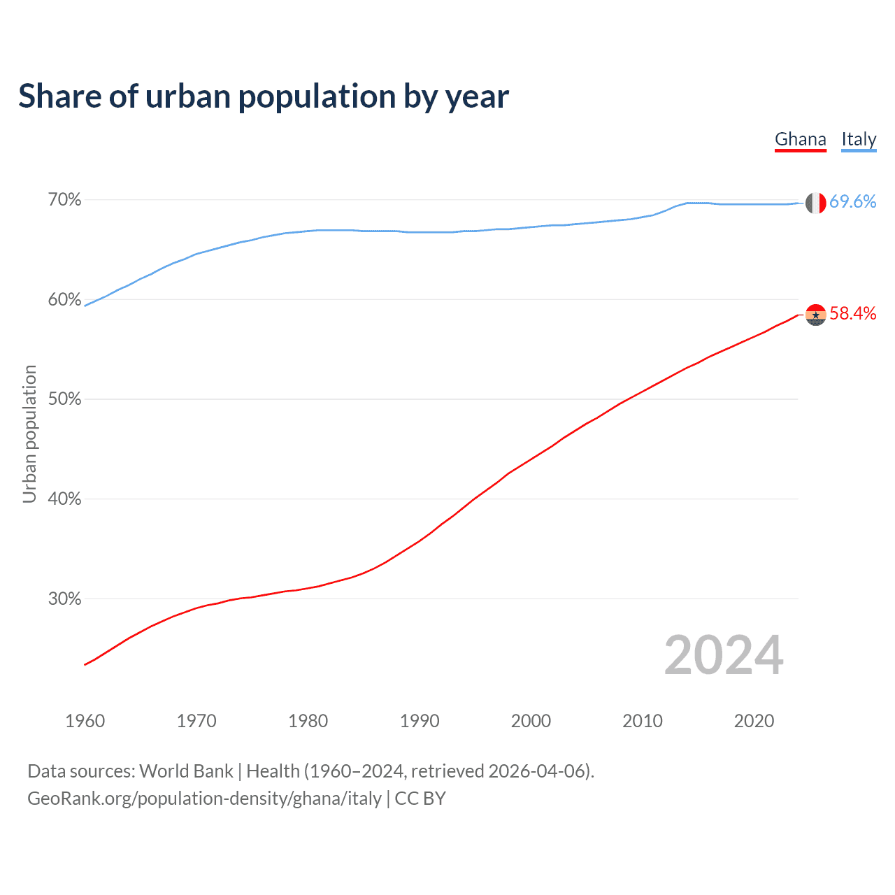From 2006 to 2026, population density in Ghana increased by 55%, compared to a 0.28% growth in Italy.