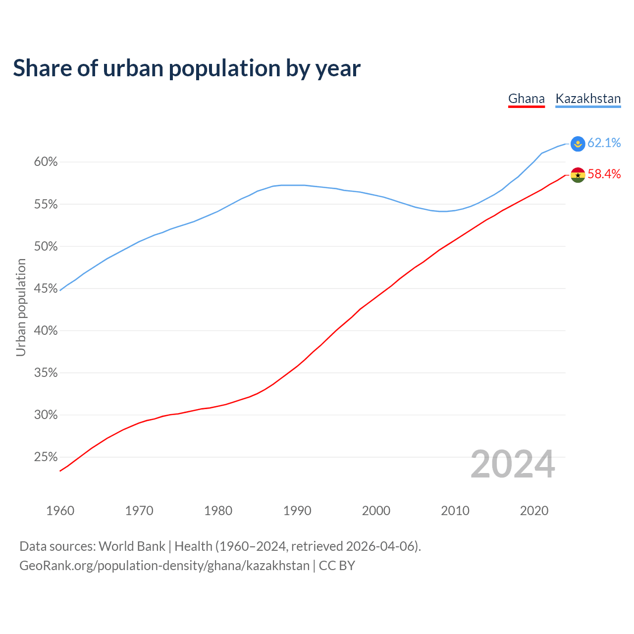 From 2004 to 2024, the share of urban population changed from 46.8% to 58.4% in Ghana and from 54.9% to 62.1% in Kazakhstan.