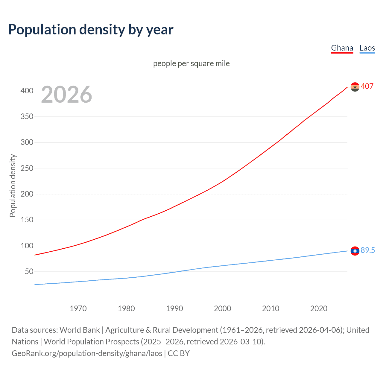 From 2006 to 2026, population density in Ghana increased by 55%, compared to a 33.8% growth in Laos.