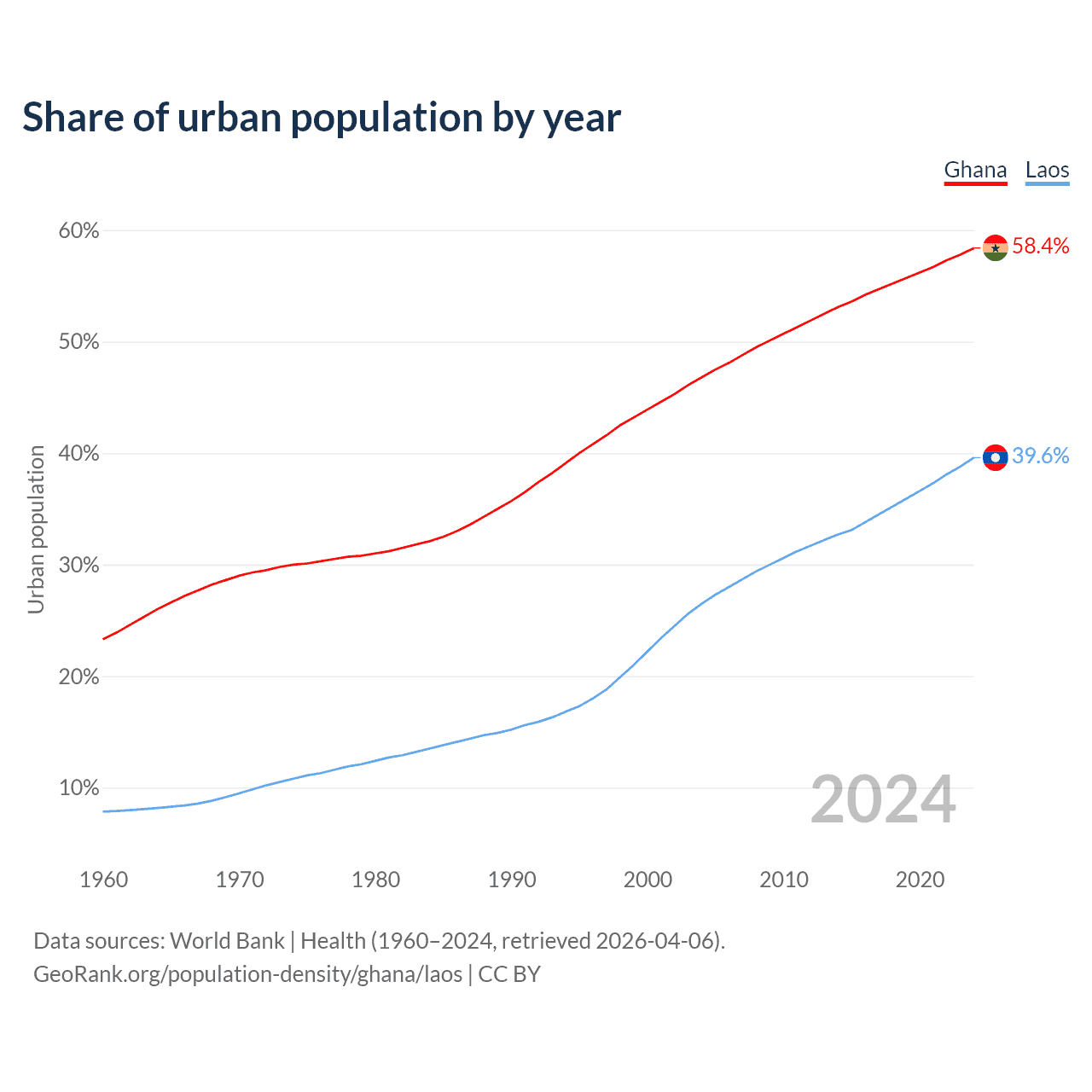 From 2004 to 2024, the share of urban population changed from 46.8% to 58.4% in Ghana and from 26.5% to 39.6% in Laos.