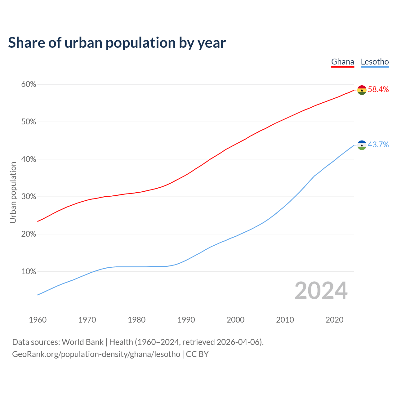 From 2004 to 2024, the share of urban population changed from 46.8% to 58.4% in Ghana and from 21.8% to 43.7% in Lesotho.