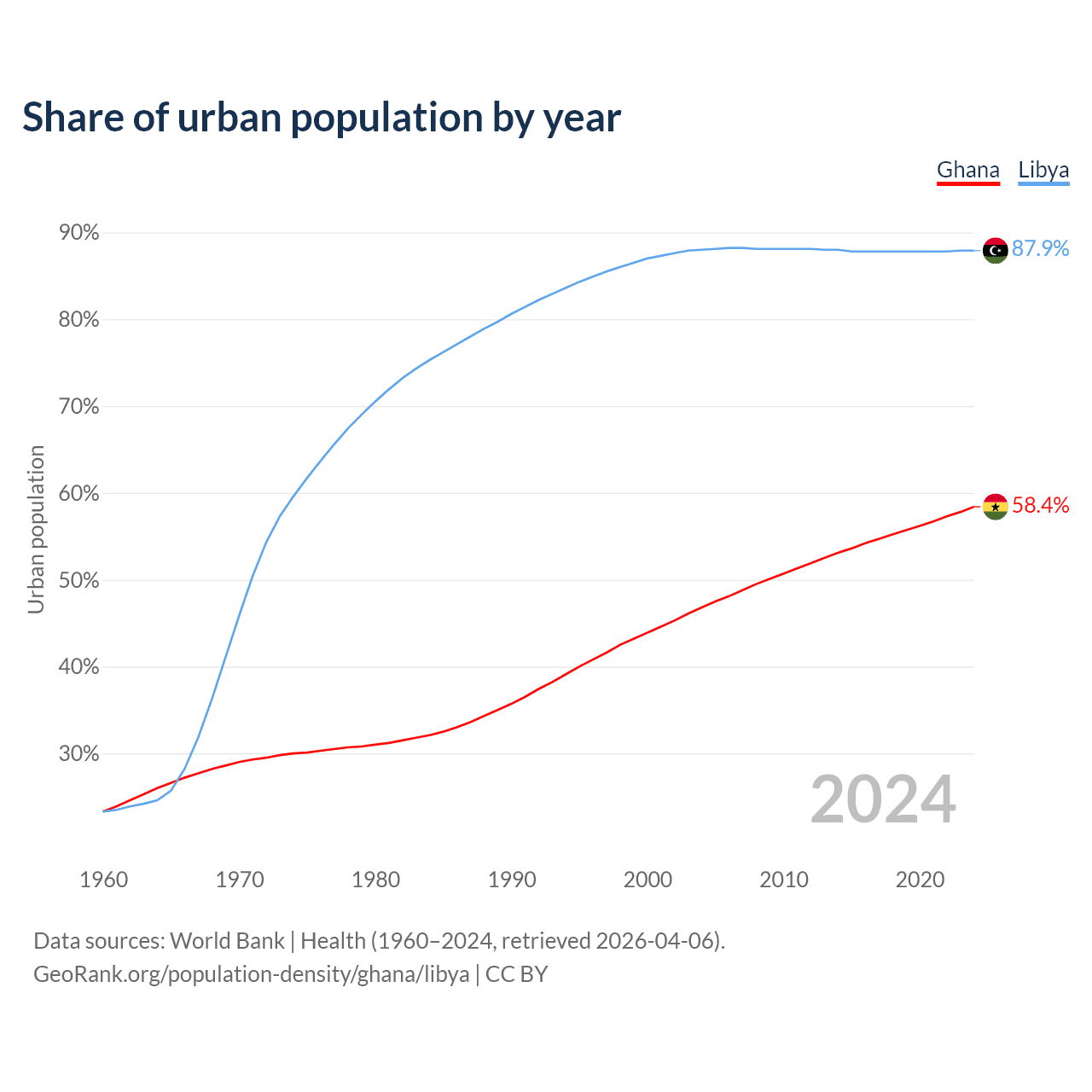 From 2004 to 2024, the share of urban population changed from 46.8% to 58.4% in Ghana and from 88% to 87.9% in Libya.