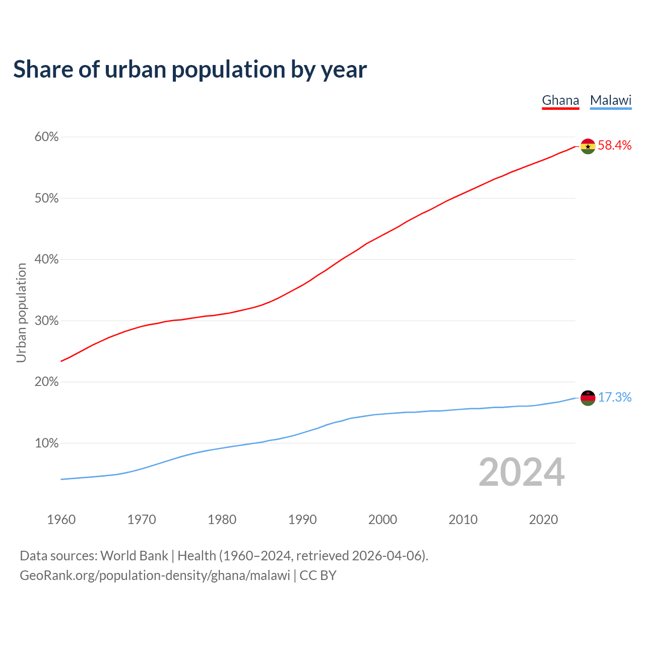 From 2004 to 2024, the share of urban population changed from 46.8% to 58.4% in Ghana and from 15% to 17.3% in Malawi.