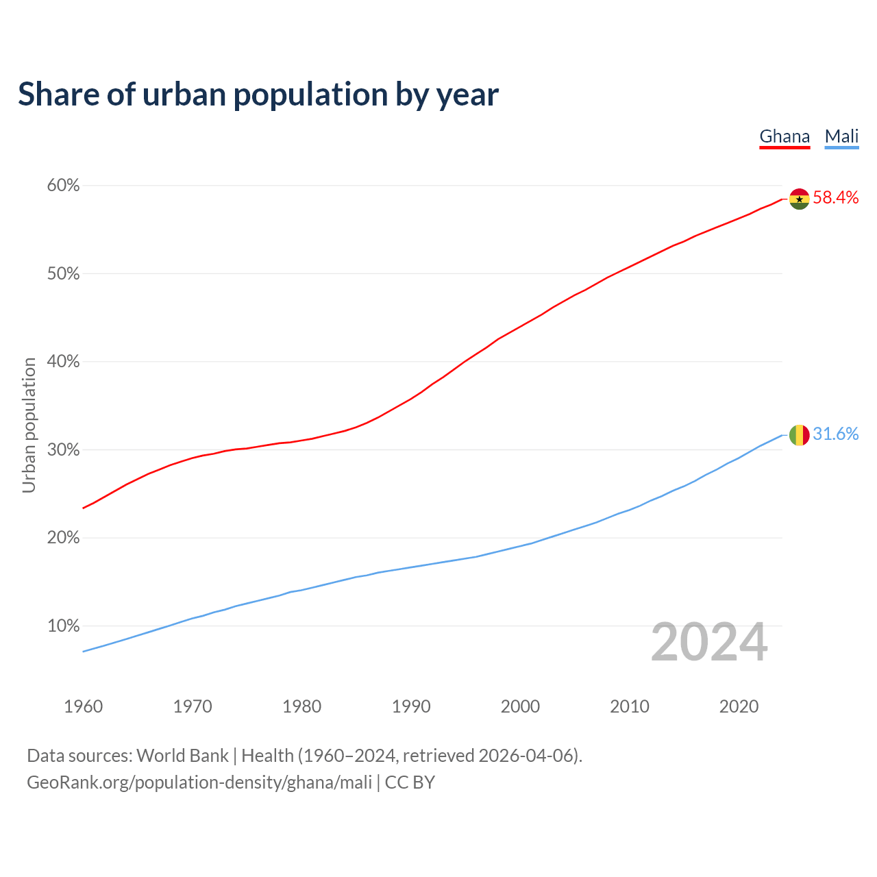 From 2004 to 2024, the share of urban population changed from 46.8% to 58.4% in Ghana and from 20.5% to 31.6% in Mali.