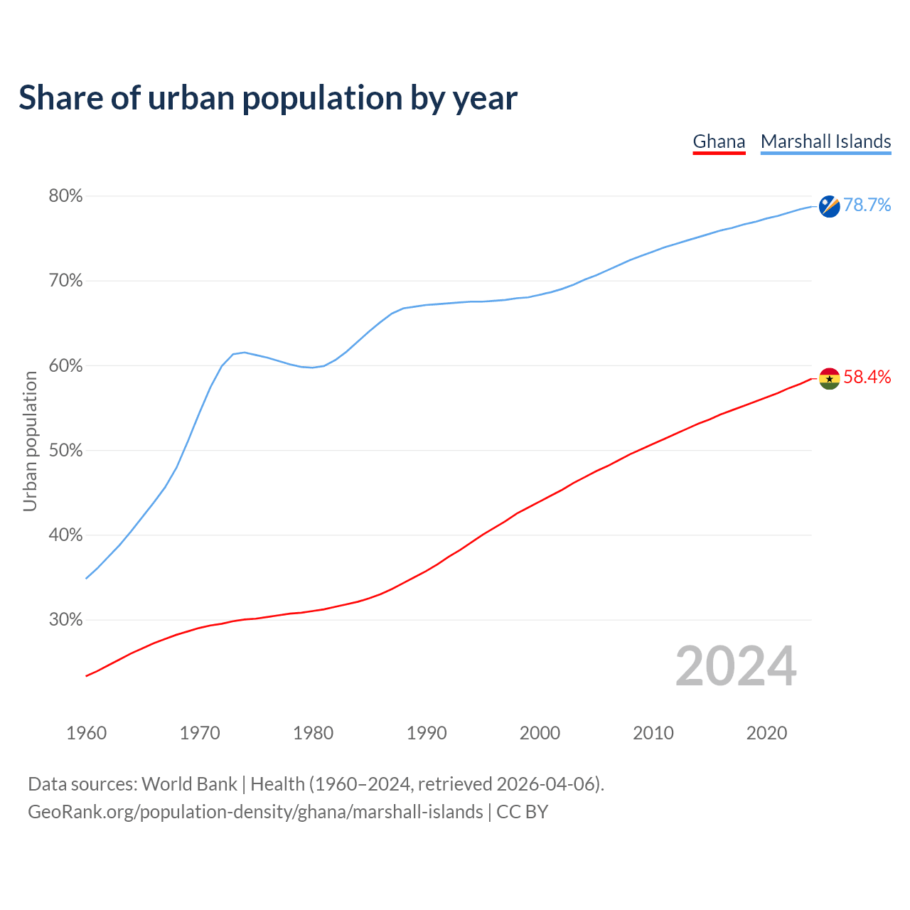 From 2004 to 2024, the share of urban population changed from 46.8% to 58.4% in Ghana and from 70.1% to 78.7% in the Marshall Islands.