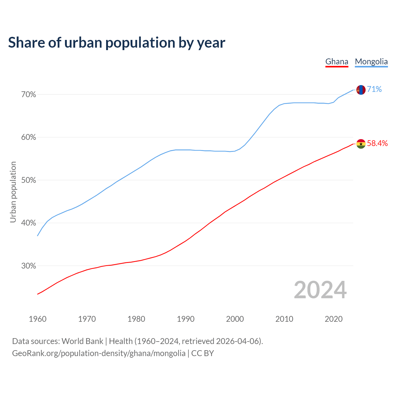 From 2004 to 2024, the share of urban population changed from 46.8% to 58.4% in Ghana and from 60.8% to 71% in Mongolia.