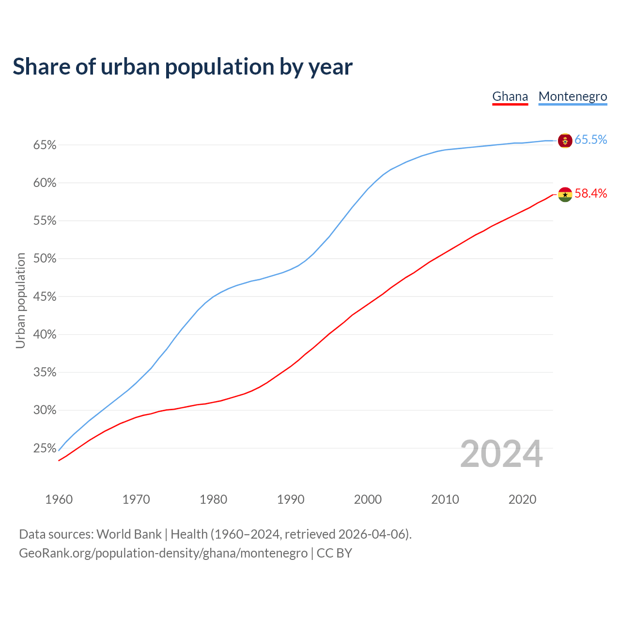 From 2004 to 2024, the share of urban population changed from 46.8% to 58.4% in Ghana and from 62.2% to 65.5% in Montenegro.
