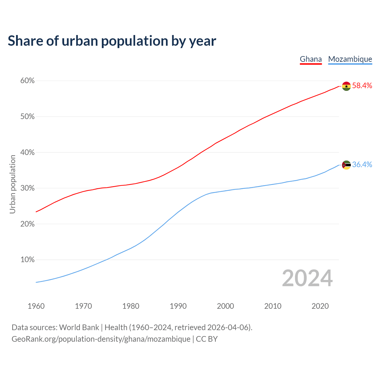From 2004 to 2024, the share of urban population changed from 46.8% to 58.4% in Ghana and from 29.9% to 36.4% in Mozambique.