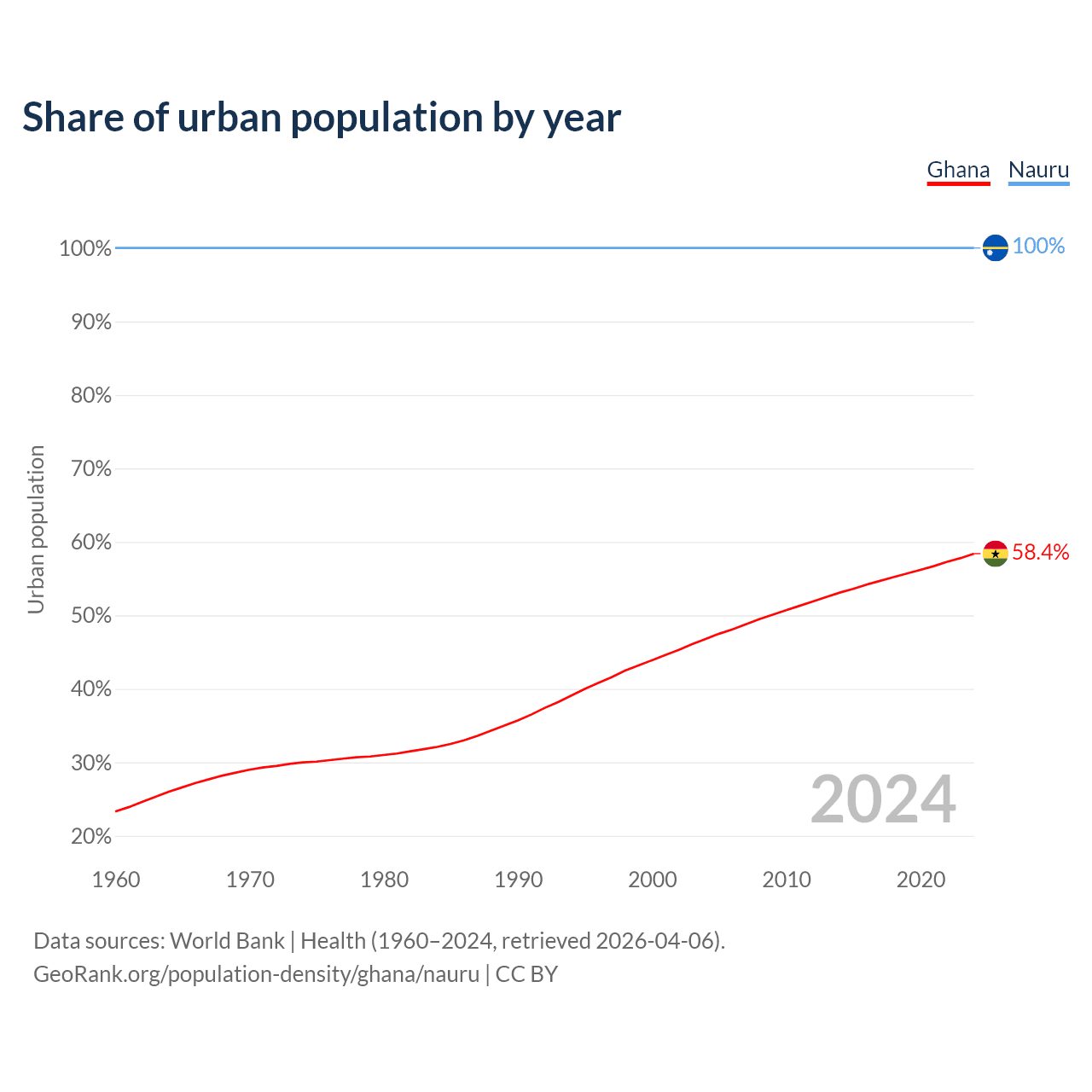 From 2004 to 2024, the share of urban population changed from 46.8% to 58.4% in Ghana and from 100% to 100% in Nauru.