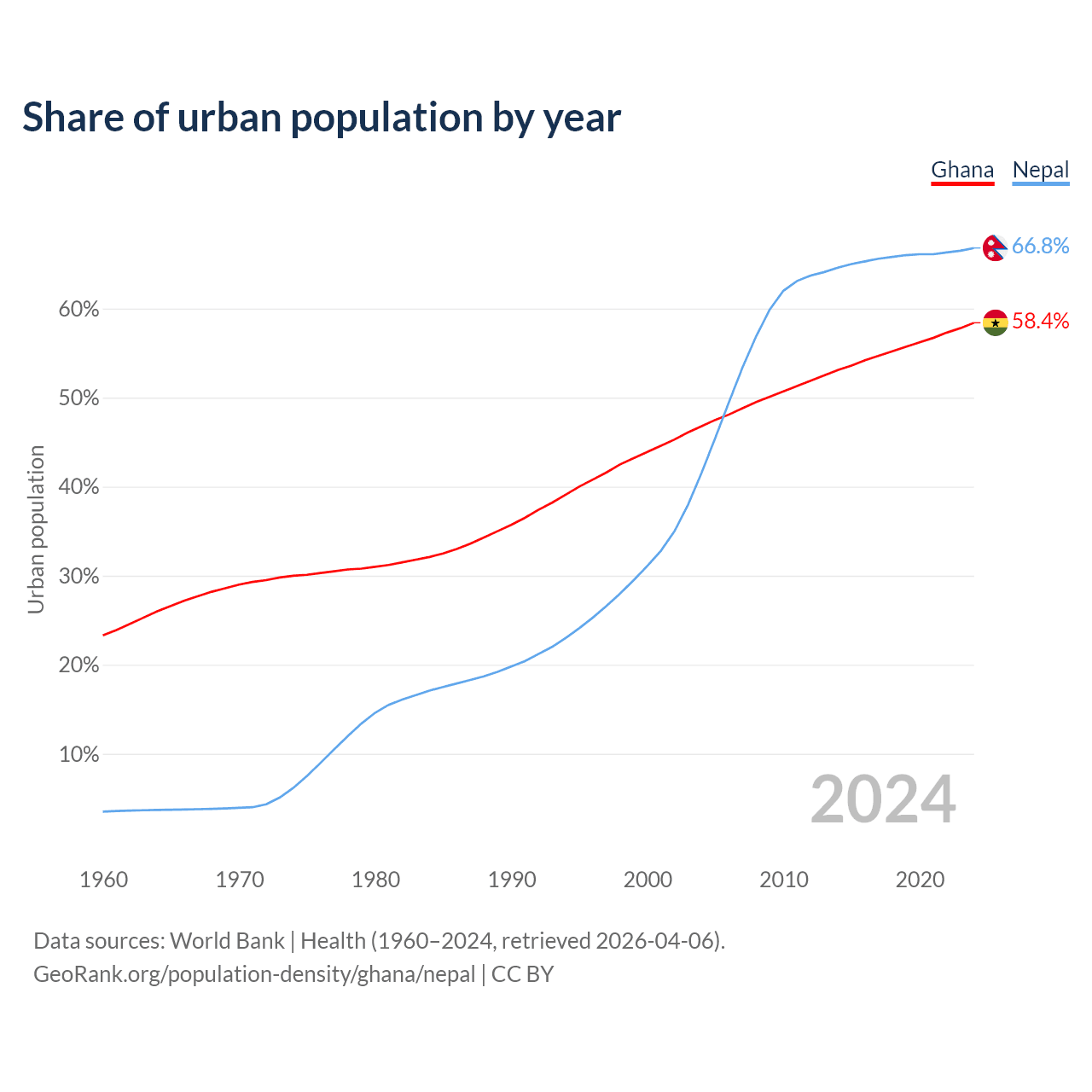From 2004 to 2024, the share of urban population changed from 46.8% to 58.4% in Ghana and from 41.6% to 66.8% in Nepal.