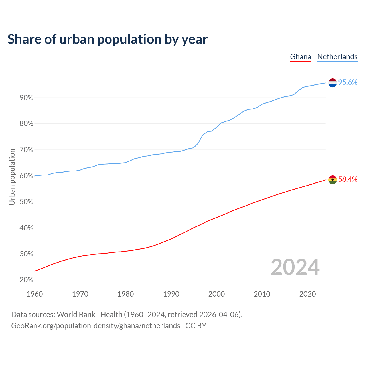 From 2004 to 2024, the share of urban population changed from 46.8% to 58.4% in Ghana and from 82.3% to 95.6% in the Netherlands.