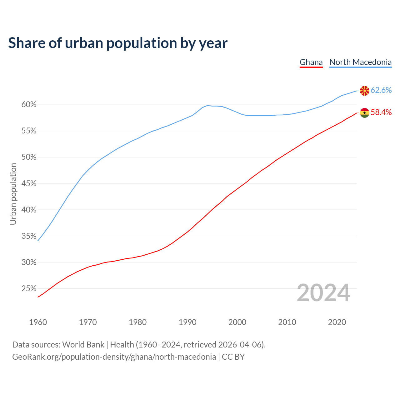 From 2004 to 2024, the share of urban population changed from 46.8% to 58.4% in Ghana and from 57.9% to 62.6% in North Macedonia.