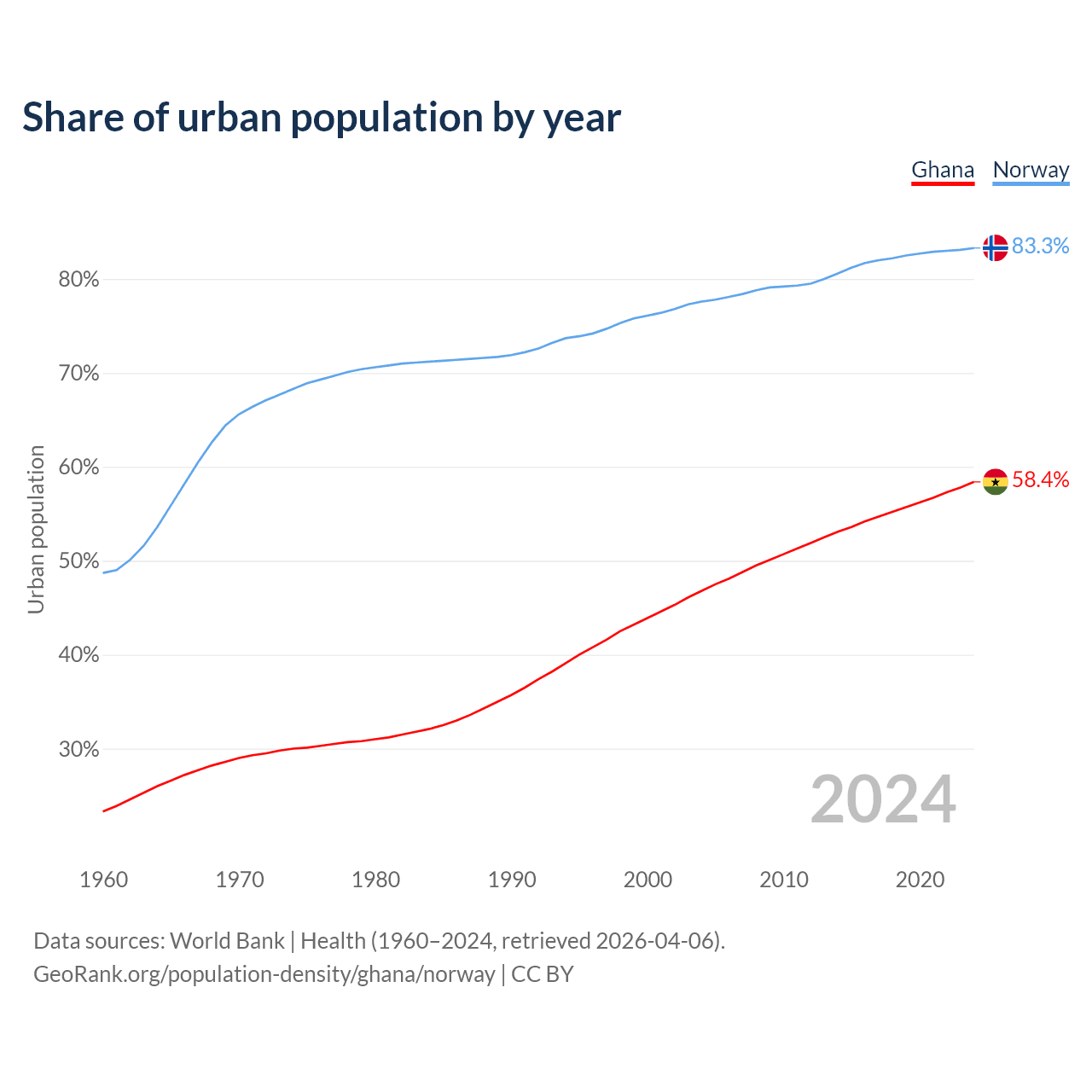 From 2004 to 2024, the share of urban population changed from 46.8% to 58.4% in Ghana and from 77.6% to 83.3% in Norway.