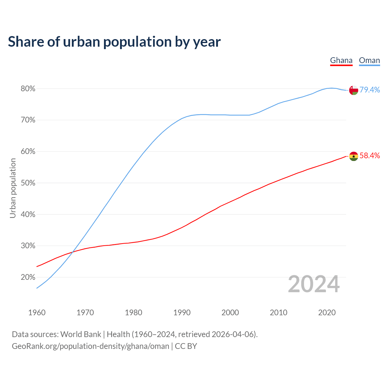 From 2004 to 2024, the share of urban population changed from 46.8% to 58.4% in Ghana and from 71.5% to 79.4% in Oman.