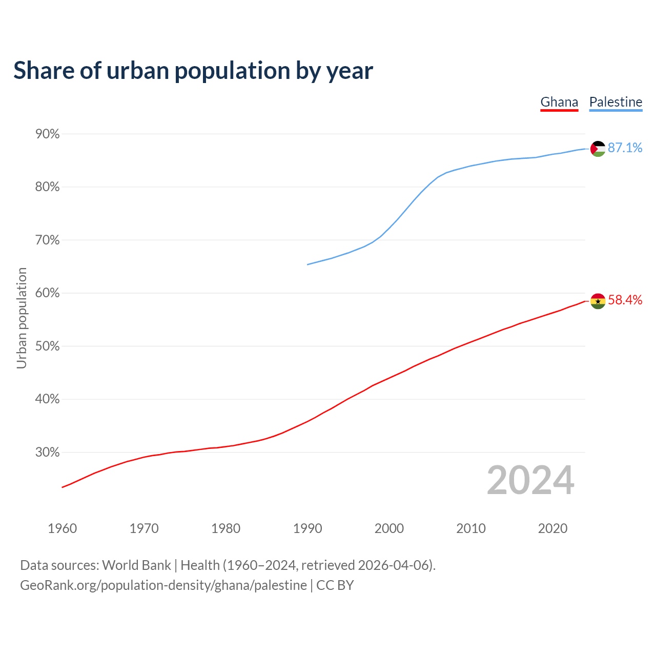 From 2004 to 2024, the share of urban population changed from 46.8% to 58.4% in Ghana and from 79% to 87.1% in Palestine.