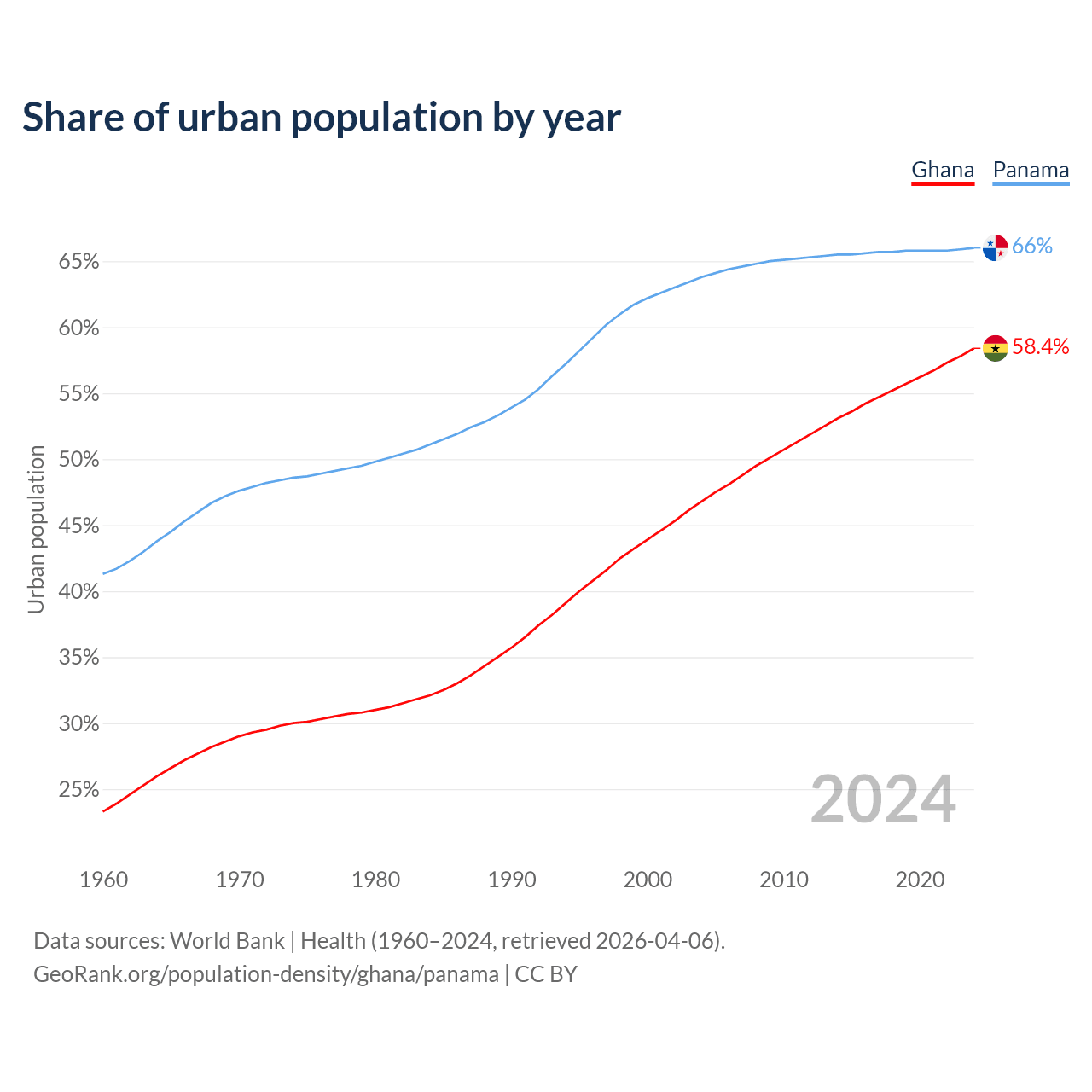 From 2004 to 2024, the share of urban population changed from 46.8% to 58.4% in Ghana and from 63.8% to 66% in Panama.