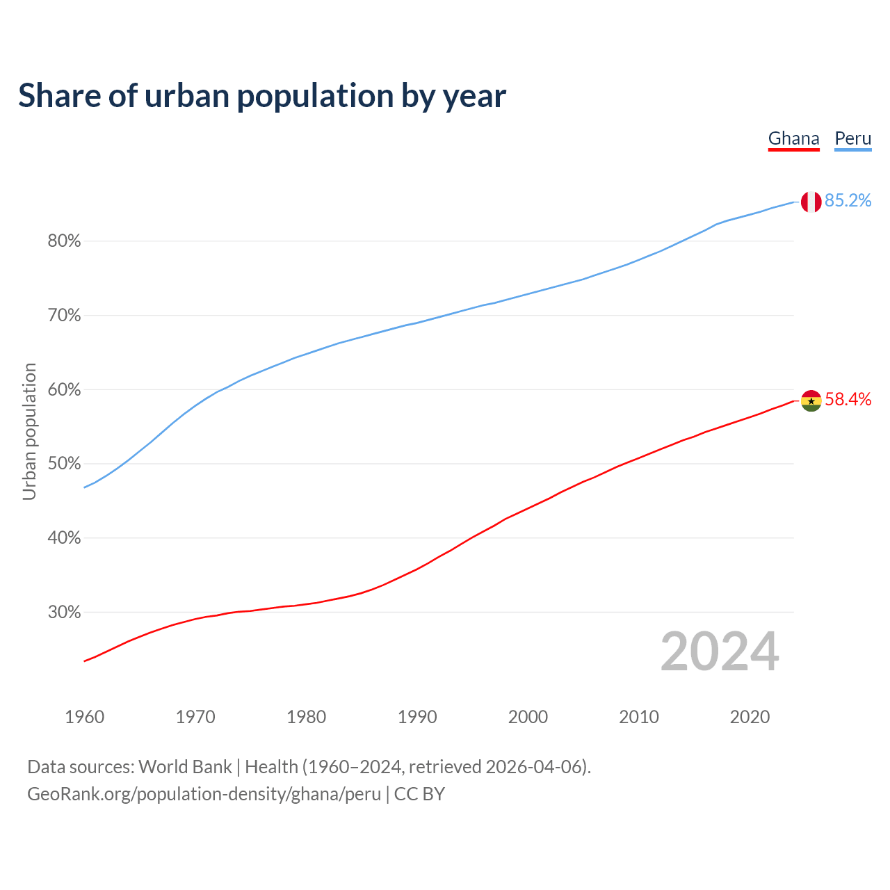 From 2004 to 2024, the share of urban population changed from 46.8% to 58.4% in Ghana and from 74.4% to 85.2% in Peru.