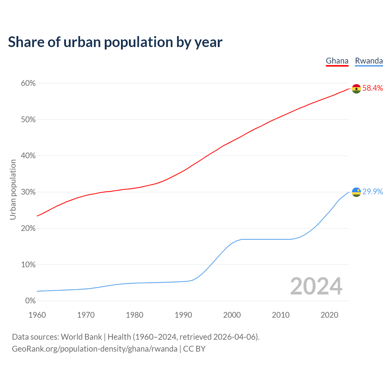 From 2006 to 2026, population density in Ghana increased by 55%, compared to a 60.1% growth in Rwanda.