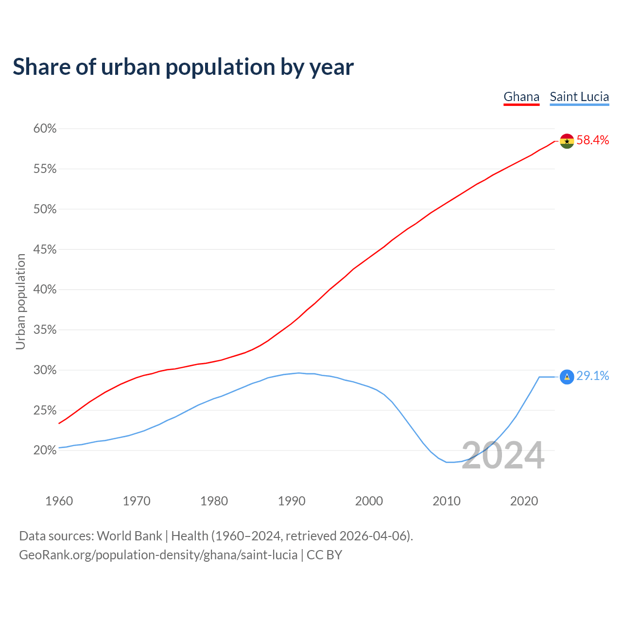 From 2004 to 2024, the share of urban population changed from 46.8% to 58.4% in Ghana and from 24.8% to 29.1% in Saint Lucia.