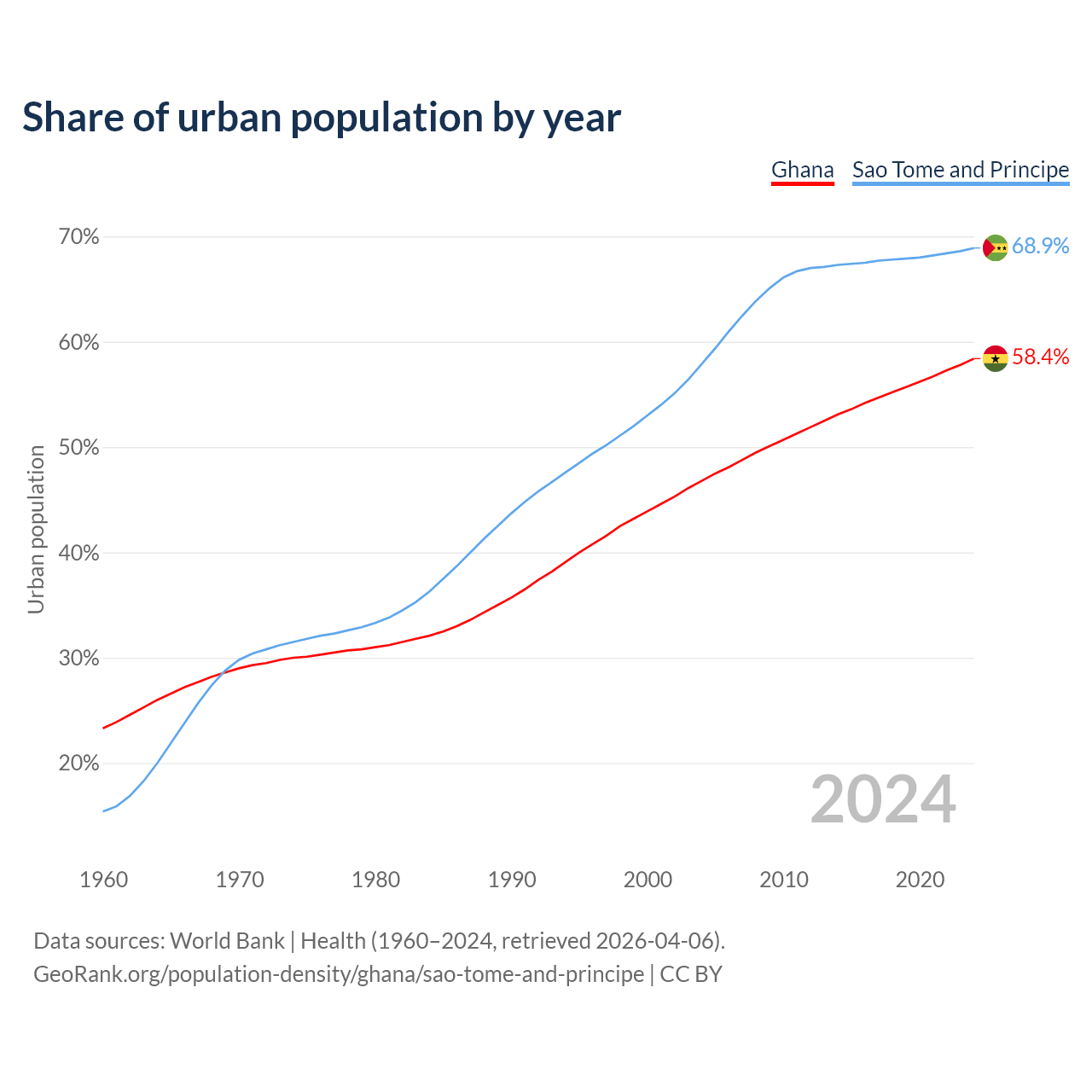 From 2004 to 2024, the share of urban population changed from 46.8% to 58.4% in Ghana and from 57.9% to 68.9% in Sao Tome and Principe.