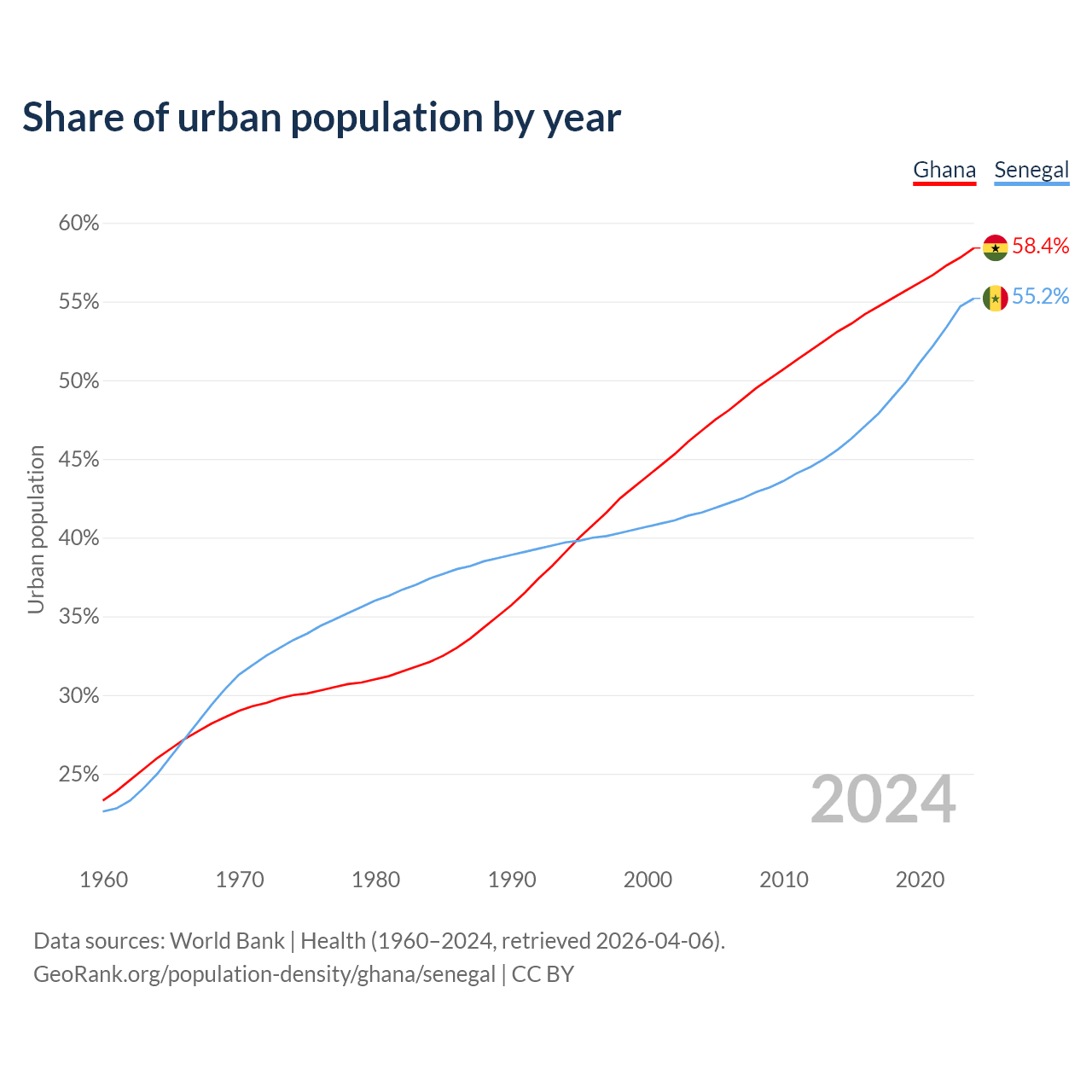 From 2004 to 2024, the share of urban population changed from 46.8% to 58.4% in Ghana and from 41.6% to 55.2% in Senegal.