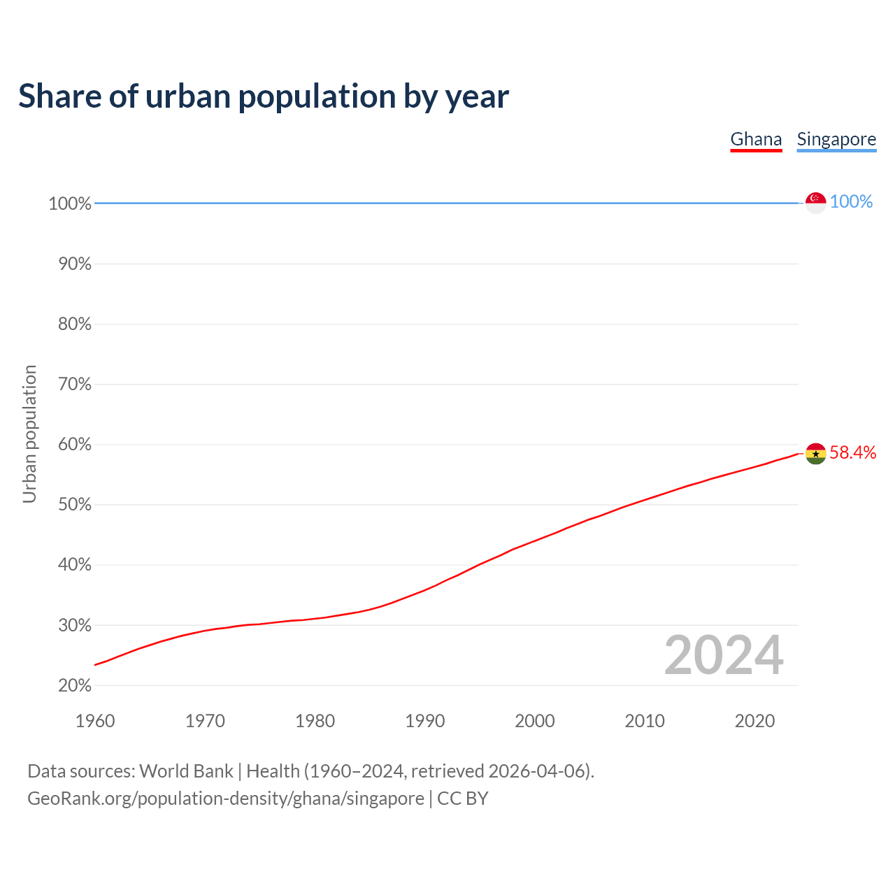 From 2004 to 2024, the share of urban population changed from 46.8% to 58.4% in Ghana and from 100% to 100% in Singapore.