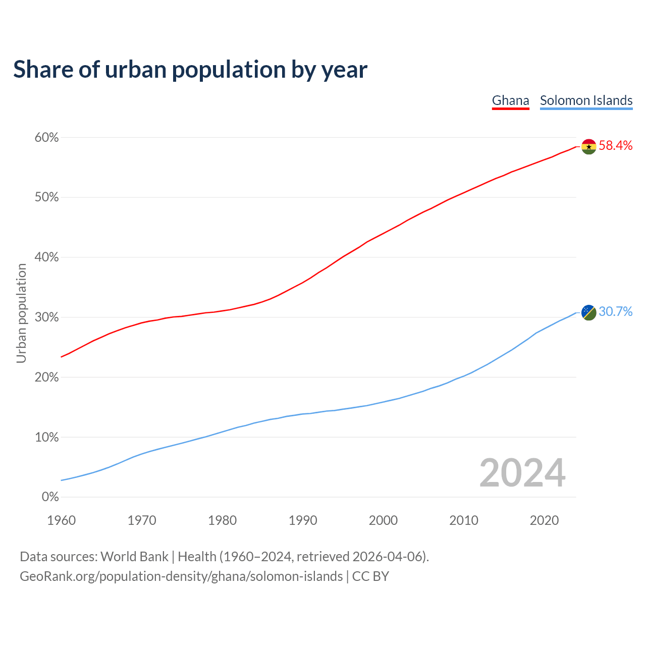 From 2004 to 2024, the share of urban population changed from 46.8% to 58.4% in Ghana and from 17.2% to 30.7% in the Solomon Islands.