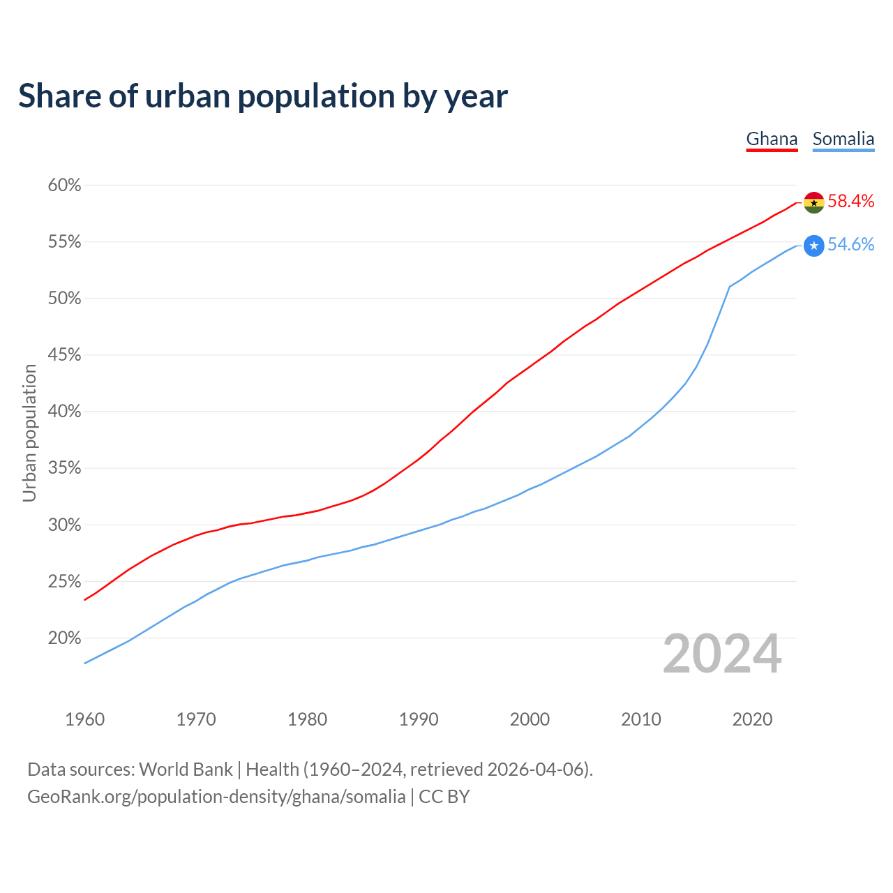 From 2004 to 2024, the share of urban population changed from 46.8% to 58.4% in Ghana and from 35% to 54.6% in Somalia.