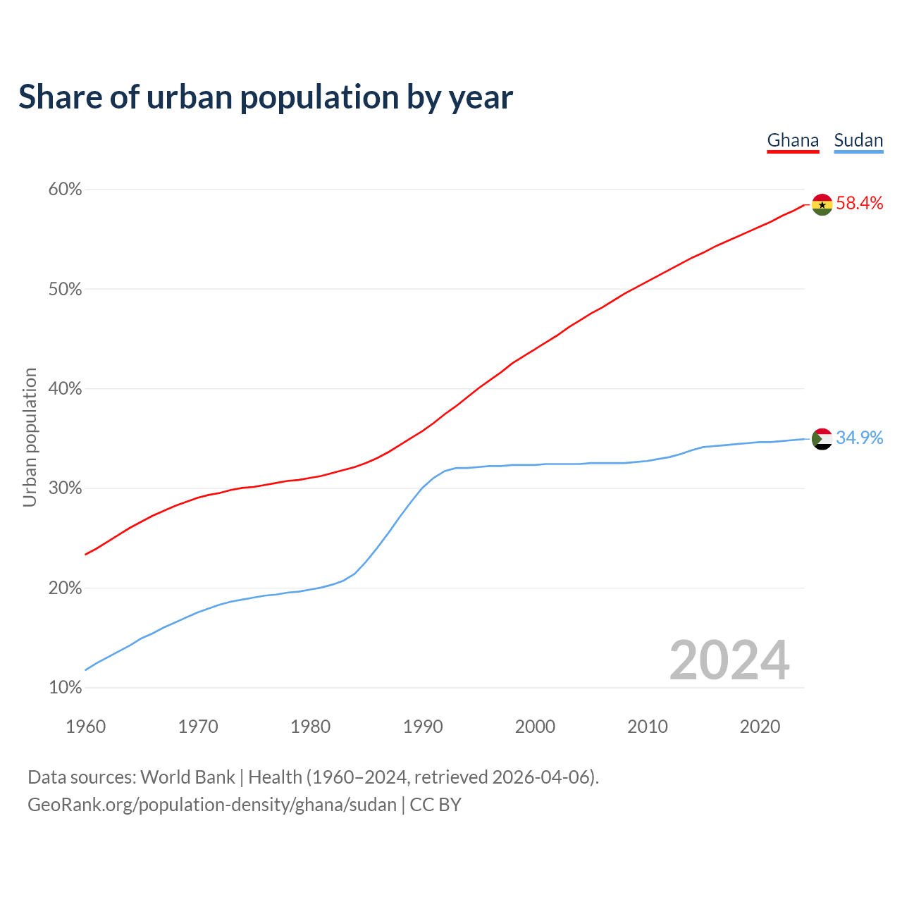 From 2004 to 2024, the share of urban population changed from 46.8% to 58.4% in Ghana and from 32.4% to 34.9% in Sudan.