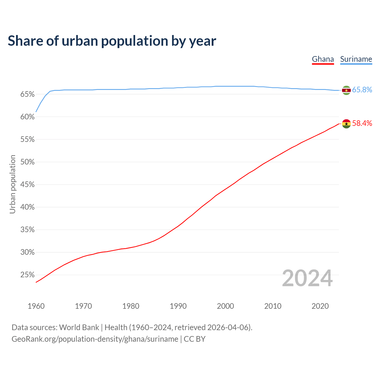 From 2004 to 2024, the share of urban population changed from 46.8% to 58.4% in Ghana and from 66.7% to 65.8% in Suriname.