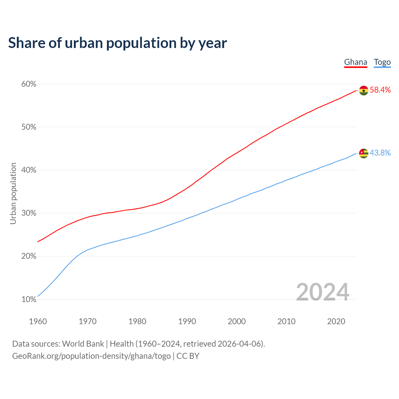 From 2004 to 2024, the share of urban population changed from 46.8% to 58.4% in Ghana and from 34.9% to 43.8% in Togo.