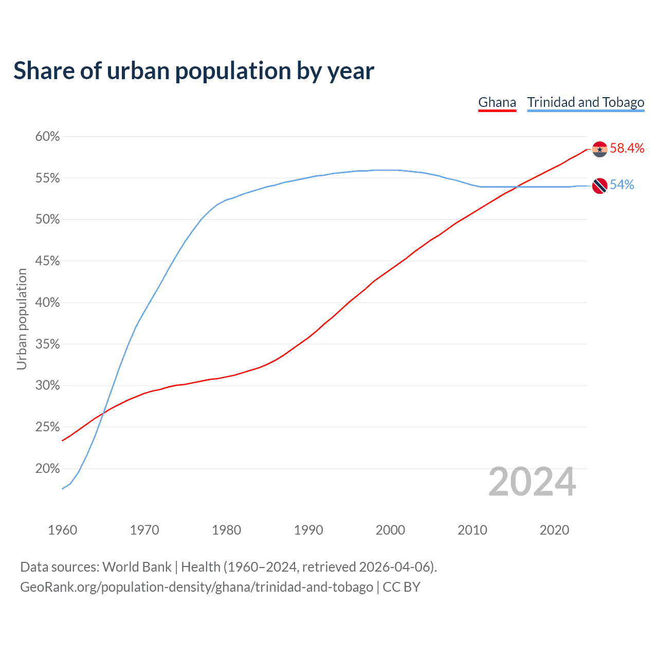 From 2004 to 2024, the share of urban population changed from 46.8% to 58.4% in Ghana and from 55.6% to 54% in Trinidad and Tobago.