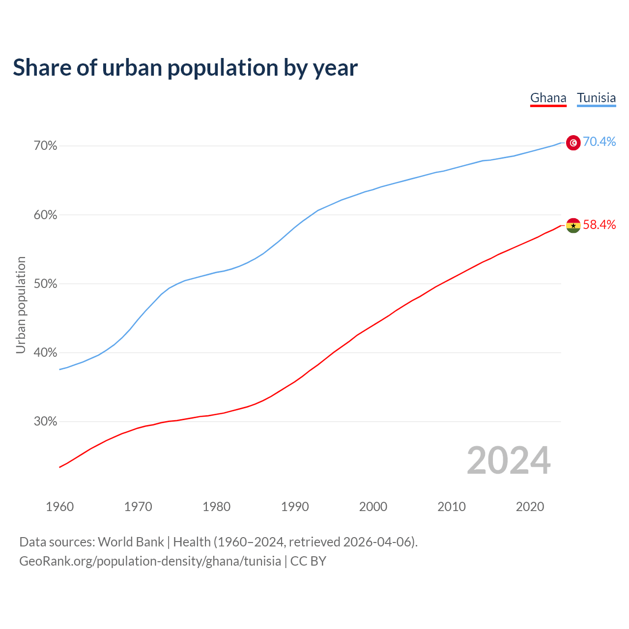 From 2004 to 2024, the share of urban population changed from 46.8% to 58.4% in Ghana and from 64.9% to 70.4% in Tunisia.
