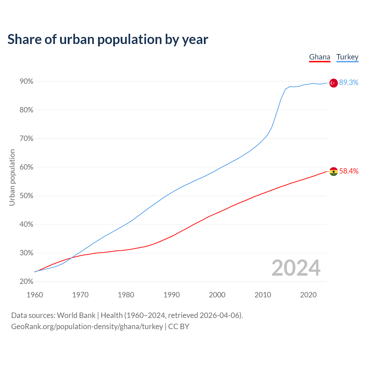From 2004 to 2024, the share of urban population changed from 46.8% to 58.4% in Ghana and from 62.4% to 89.3% in Turkey.