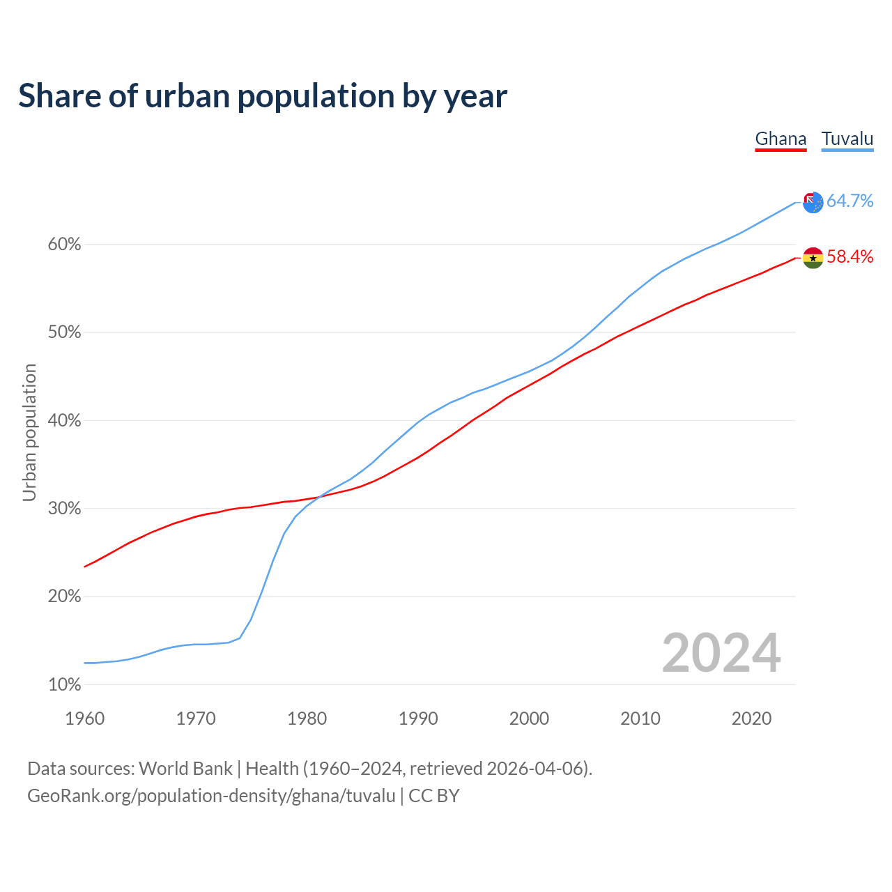 From 2004 to 2024, the share of urban population changed from 46.8% to 58.4% in Ghana and from 48.4% to 64.7% in Tuvalu.