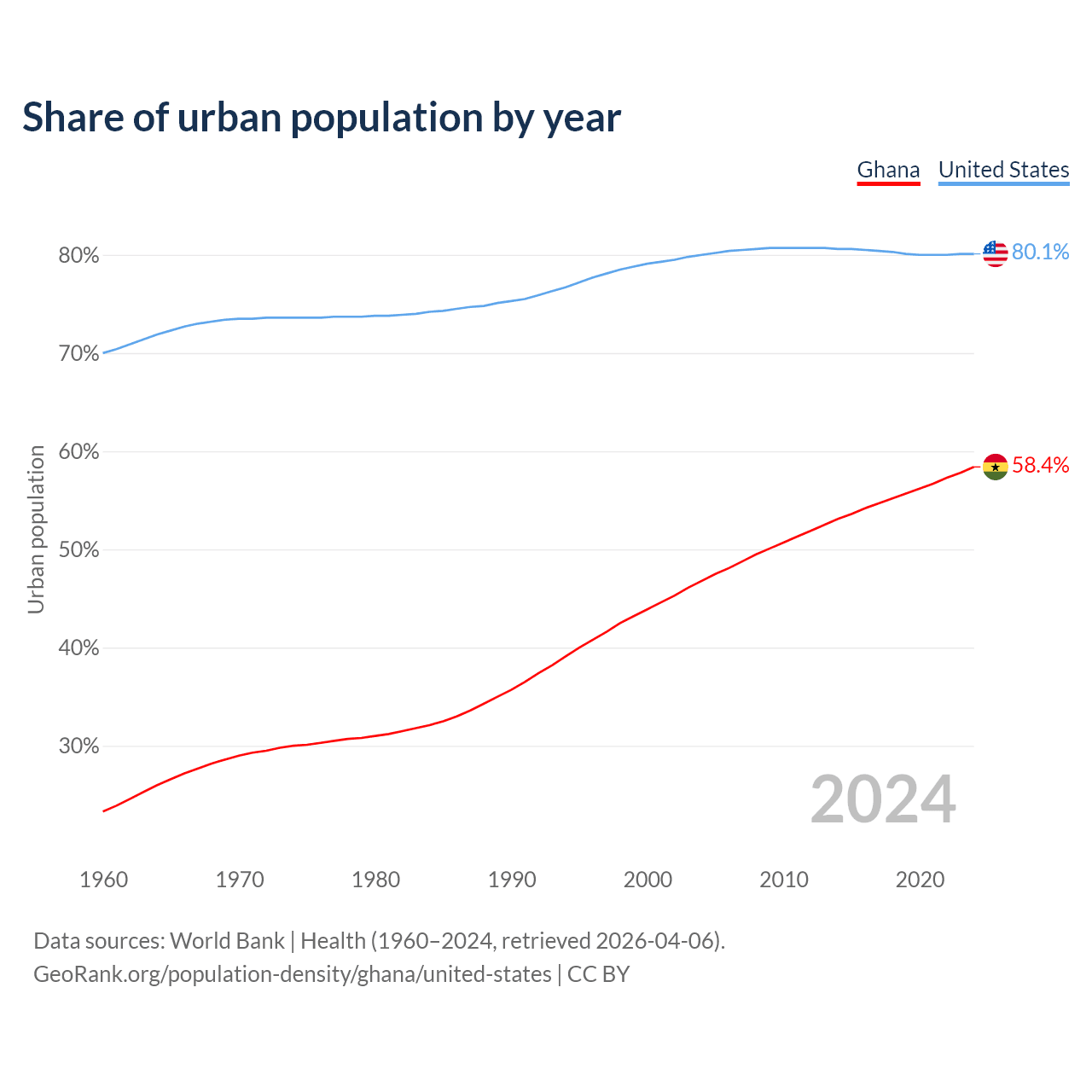 From 2004 to 2024, the share of urban population changed from 46.8% to 58.4% in Ghana and from 80% to 80.1% in the United States.