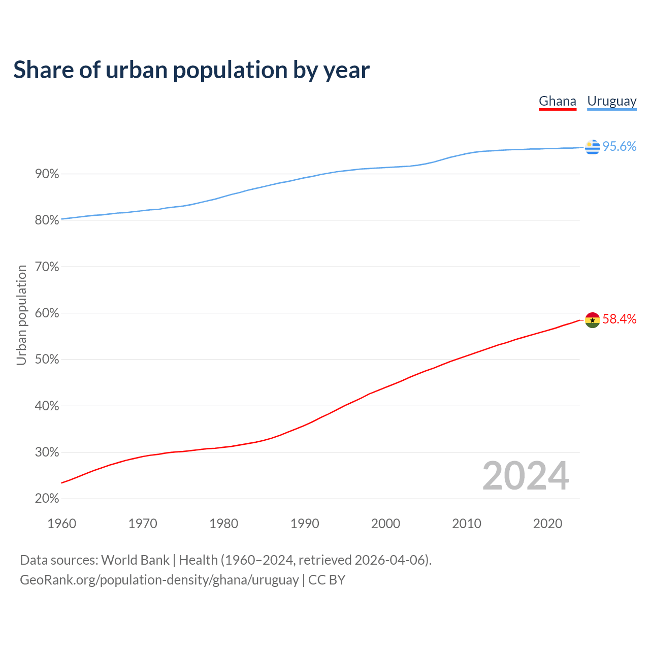 From 2006 to 2026, population density in Ghana increased by 55%, compared to a 2.84% growth in Uruguay.