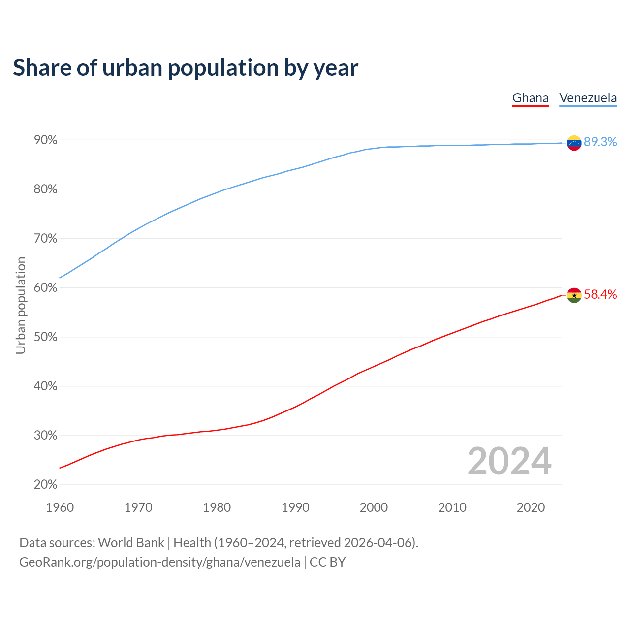 From 2006 to 2026, population density in Ghana increased by 55%, compared to a 5.16% growth in Venezuela.