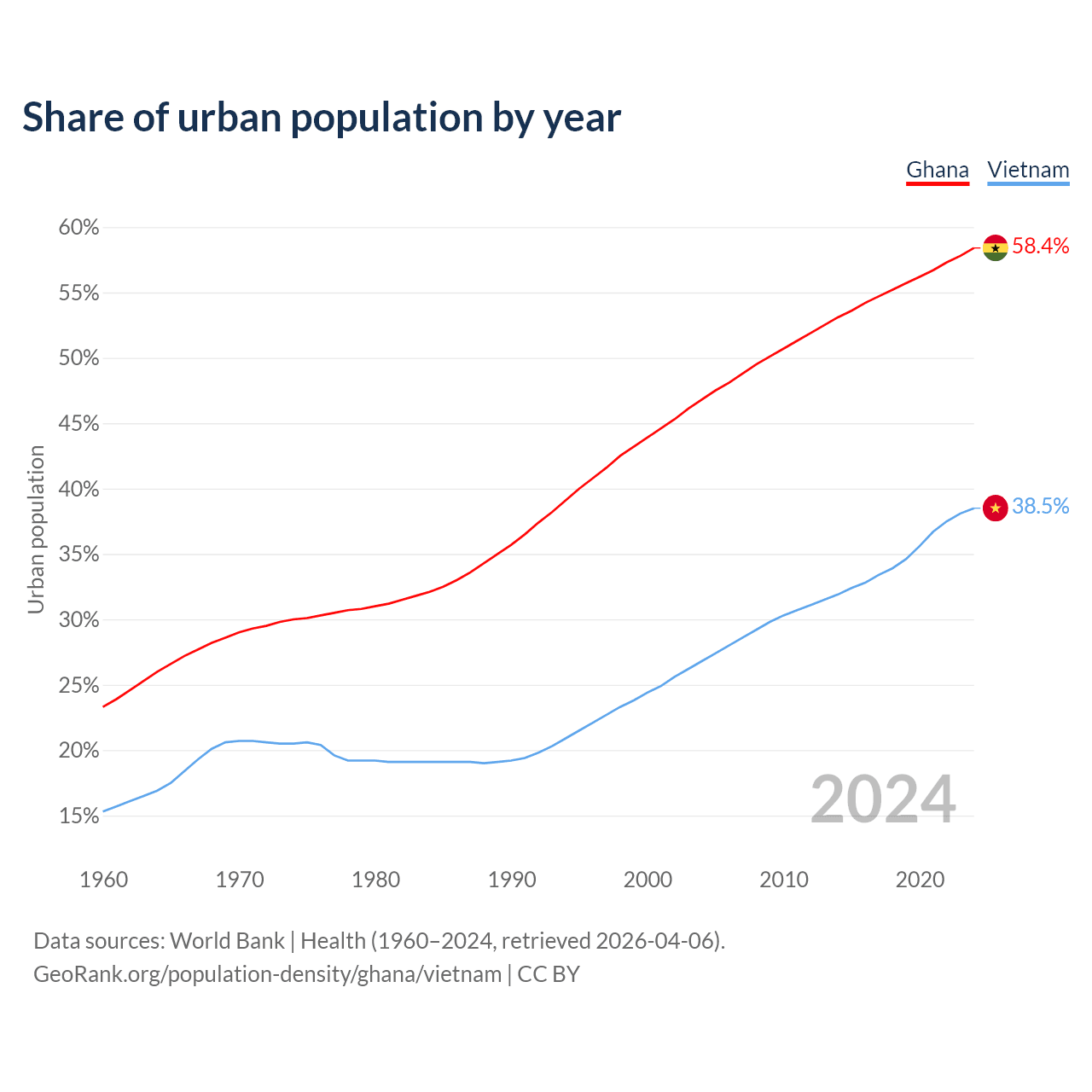 From 2004 to 2024, the share of urban population changed from 46.8% to 58.4% in Ghana and from 26.8% to 38.5% in Vietnam.