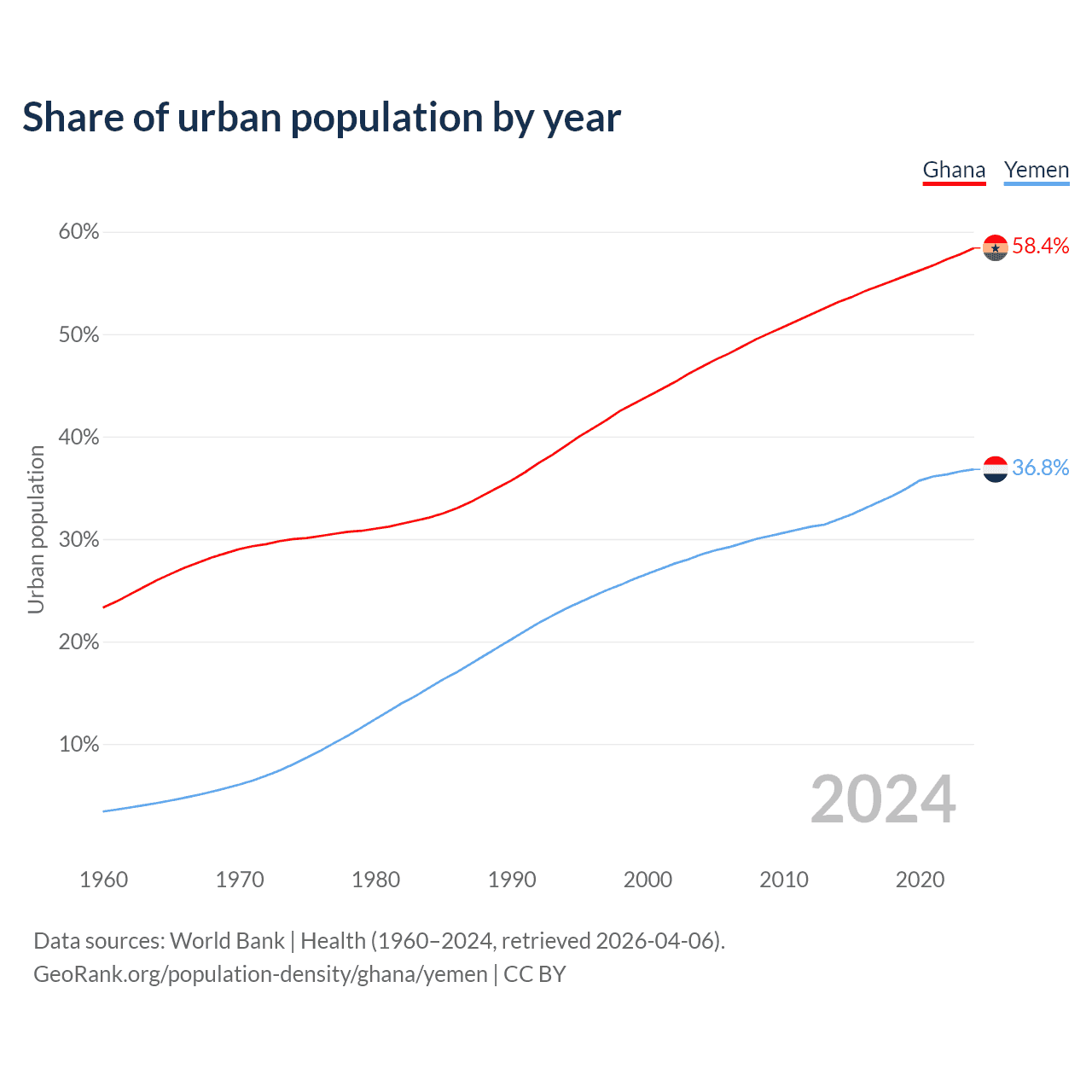 From 2004 to 2024, the share of urban population changed from 46.8% to 58.4% in Ghana and from 28.5% to 36.8% in Yemen.